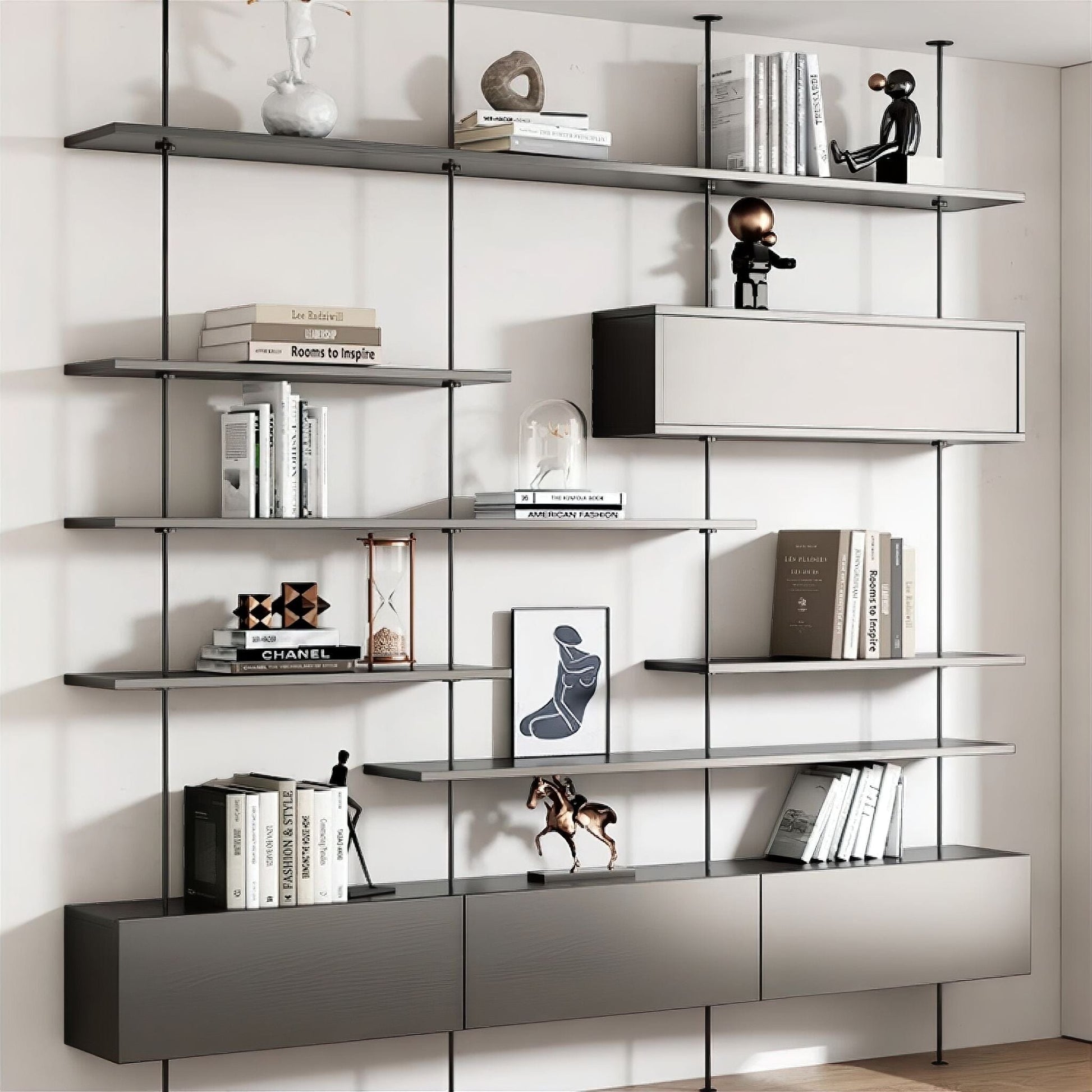 A perfect blend of sleek design and practical functionality. This modern bookshelf features durable stainless steel rods that extend floor to ceiling, providing a striking visual element while offering exceptional stability. Its unique design allows for adjustable shelves, which can be easily slid up and down to customise the height according to your needs.
