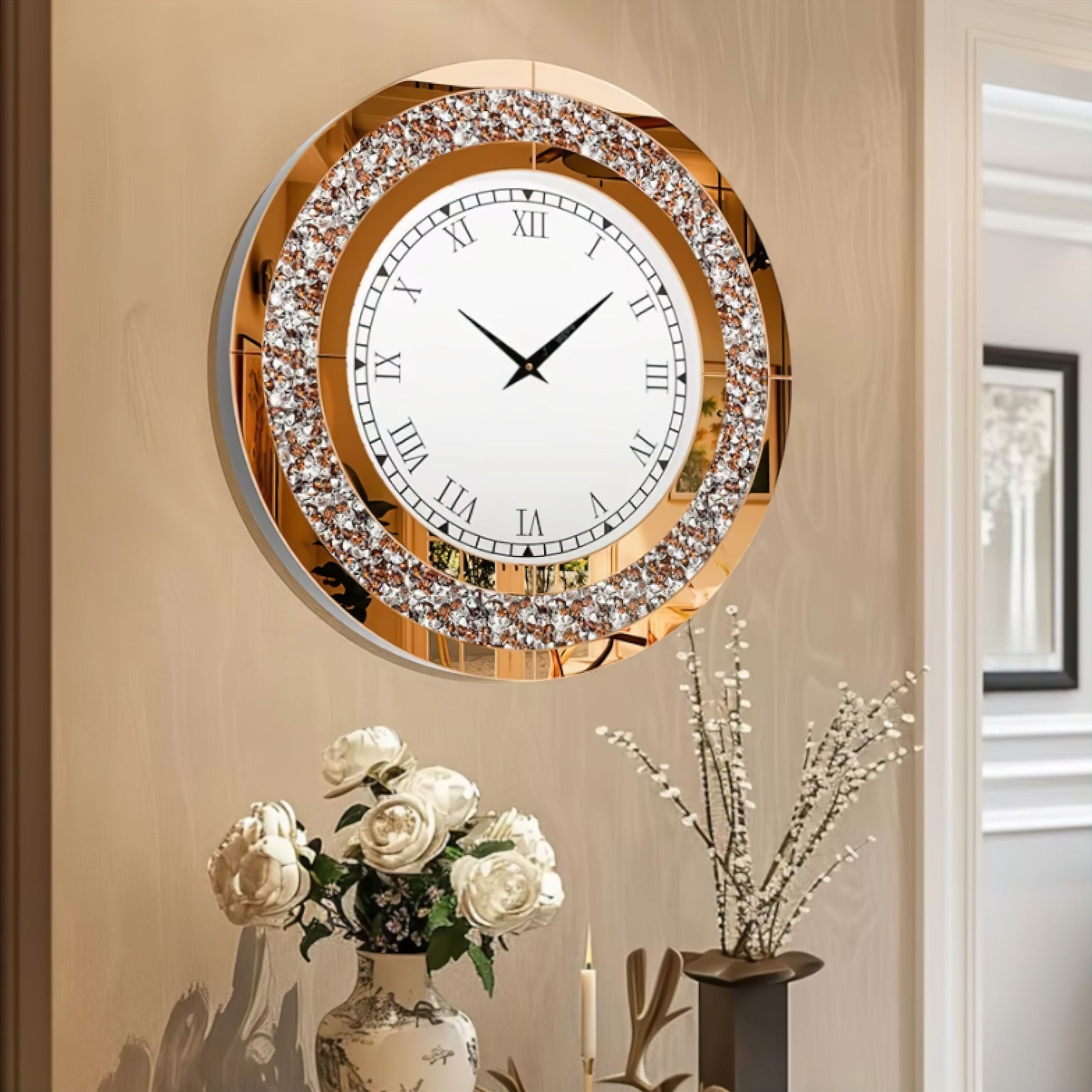 The clock's frame is made from a blend of mirror and glass, with a stunning beveled mirror finish and sparkling crushed diamond details that catch the light. Ideal for bedrooms, living rooms, home offices, or fireplaces, the Tommaso Wall Clock combines functionality with a glamorous, contemporary look.